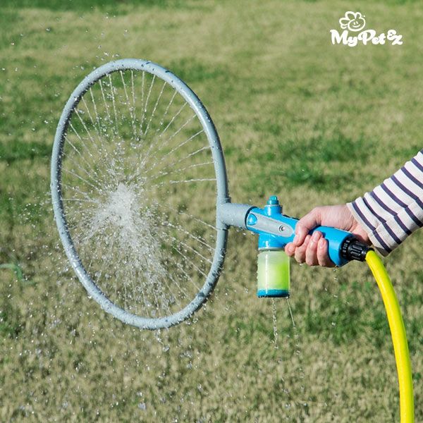 Obroč za umivanje psov enakomerno porazdeli vodo, s čimer se zagotovi popolna čistoča in nega živali. V razpršilni pištoli lahko nastavimo pritisk dotoka vode in dodamo milo za še boljše rezultate. V kompletu dobite tudi rokavico iz mikrovlaken s katero žival po kopanju obrišete.