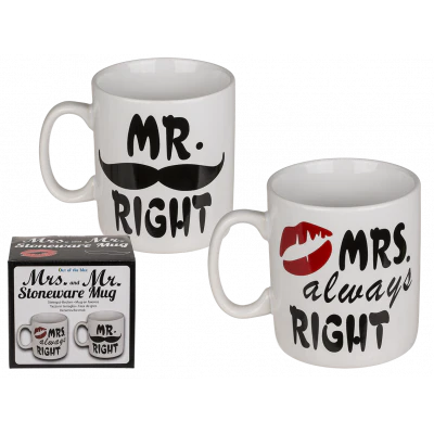 Skodelici Mr. Right & Mrs. Always Right sta izvirni in popolni kot darilo za valentinovo, obletnice, poroke ali katerokoli drugo romantično priložnost.